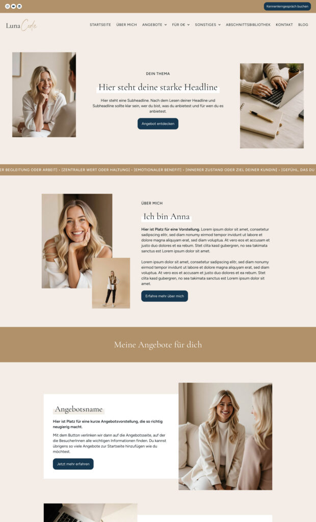 Und so entstand das LunaCode Theme. Kein Online Kurs wie früher. Dort habe ich ja den Fokus auf die Komplettumsetzung gelegt. Ich habe in meinen Kursen also ganz genau gezeigt, wie alles geht und wie man eine Website von Grund auf neu aufbaut (doch Spoiler: Auch wenn man es erklärt bekommt, dauert der Prozess dennoch ganz schön lang. Und das kann überfordern. Und das war das Problem, das ich mit dem neuen Angebot lösen wollte).